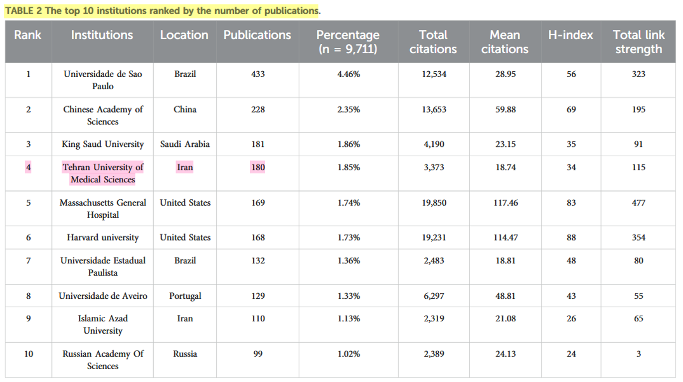 با افتخار اعلام می‌شود که در مقاله‌ علمی و معتبر «Exploring Research Dynamics of PDT in Anti-Infective Applications (2004–2024): A Bibliometric Perspective»  که در ژورنال Frontiers in Pharmacology (Impact Factor: 4.4)  در تاریخ 30 می 2025 منتشر شده، جایگاه برجسته‌ی جمهوری اسلامی ایران و دانشگاه علوم پزشکی تهران به‌روشنی به تصویر کشیده شده است.